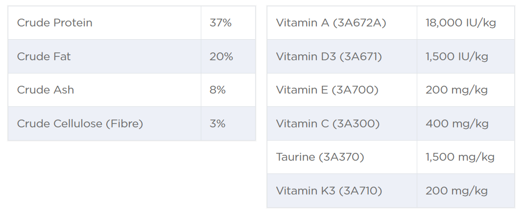 Protein động vật (gà) (khử nước), ngũ cốc (gạo, bắp, lúa mì), mỡ gà, gluten bắp, củ cải đường, hương gan, vitamin và khoáng chất, hạt lanh, men bia, muối, taurine, MOS (thành tế bào nấm men), chiết xuất cây yucca schidigera, chất bảo quản chống oxy hoá.