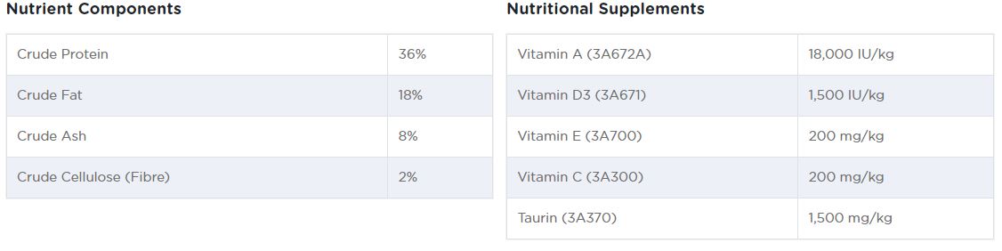 Protein gà đã qua xử lý, bắp, mỡ gà, gạo, bã củ dền, hương gan, vitamin và khoáng chất, xylo-oligosaccharides, men bia, hạt lanh, muối, chiết xuất cây yucca schidigera, I-carnitine, chất bảo quản chống oxy hóa.